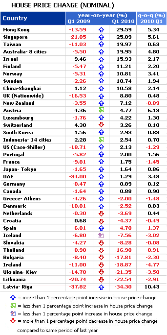 Повышение цен на жилье в сравнении с I кварталом 2009 года наблюдалось также в Австралии (19,9%), Израиле (15,9%), Финляндии (11,2%), Норвегии (10,8%), Швеции (10,7%), Китае(Шанхай) (10,6%), Великобритании (8,8%), Новой Зеландии (7,1%), Австрии (4,8%), Люксембурге (4,2%), Швейцарии (3,3%), Южной Корее (2,9%), Индонезии (2,5%), США (2,1%), Португалии (2%), Франции (1,8%), Японии (Токио) (1,6%), ОАЭ (1,3%), Германии(0,9%), Канаде (0,9%).